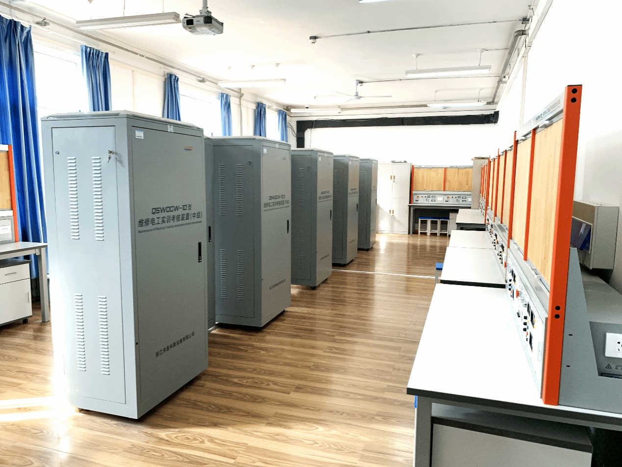 本实训室主要面向电气工程及其自动化、自动化、智能装备与系统等专业,拥有维修电工实训考核装置(中级)(立柜式单面网孔板)10台,初级维修电工技能实训考核装置(定制版)10台。可进行《电工电子技术》、《电气控制与可编程控制技术》等课程的实验教学;同时还可以进行《专业实习》、《机电技术综合实验》、 《电机综合实验》 《电气综合实践》等实践教学。本实训室以强电实习实训为主,可以开展三相异步电动机点动控制线路、电动机定子串电阻减压启动控制线路、三相异步电动机正反转控制、三相异步电动机自锁控制线路、日光灯照明灯具的组装及故障处理、户内低压配电柜(箱)组装、配线练习等10余项实训项目。实训室装置采用标准配电柜为主体柜,完全模拟工厂实际电气控制设备,满足工厂化实训要求,将企业先进的智能制造技术和真实的生产环境融合于实践教学环节,最大限度模拟生产实际。同时,该实训室可以通过增加其他新器件扩展实验项目,实验室扩展性强,实验项目根据需要可灵活设置。