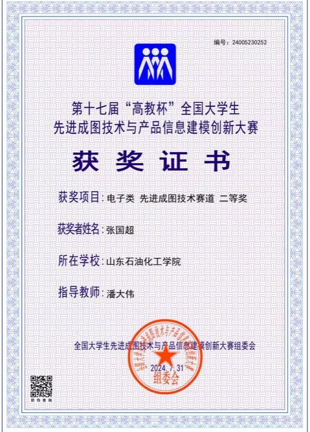 2024年7月,获“山东省大学生先进成图技术与产品信息建模创新大赛”电子成图技术团体赛道,省级二等奖;