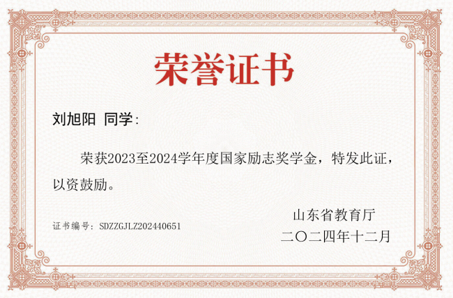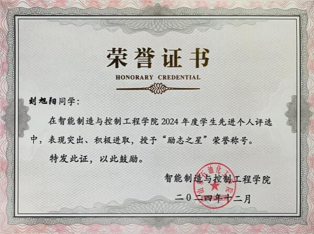 2024.12获智能制造与控制工程学院“励志之星”荣誉称号;