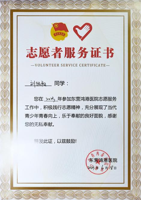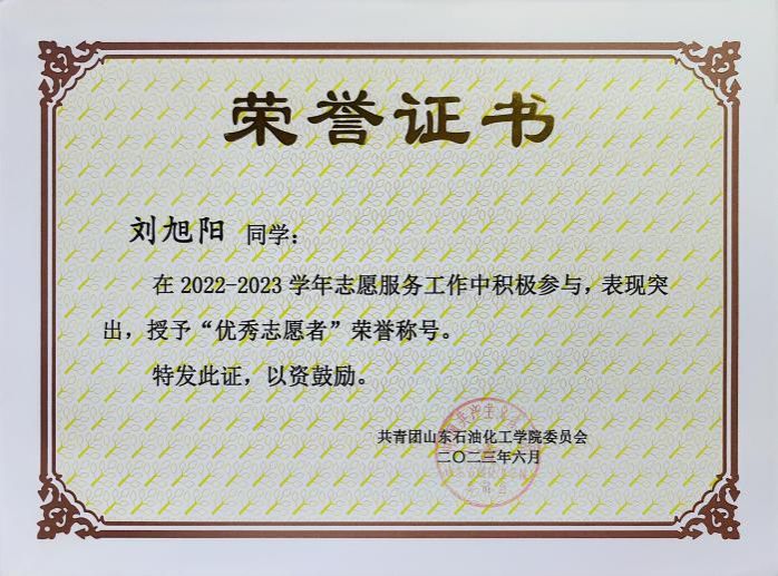 2023.6获山东石油化工学院“优秀志愿者”荣誉称号;