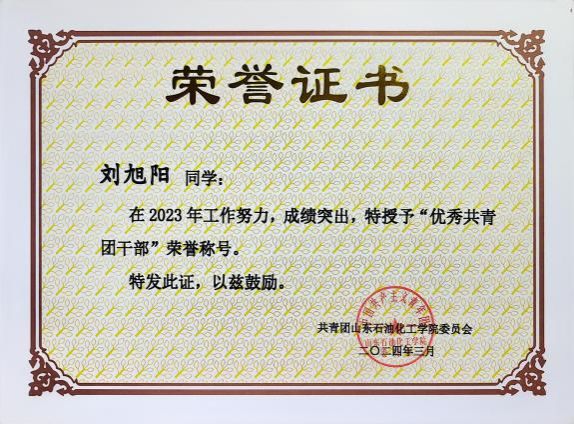 2024.3获山东石油化工学院“优秀共青团干部”荣誉称号;
