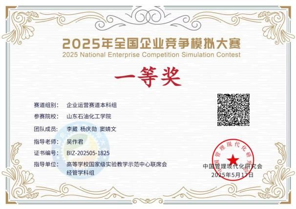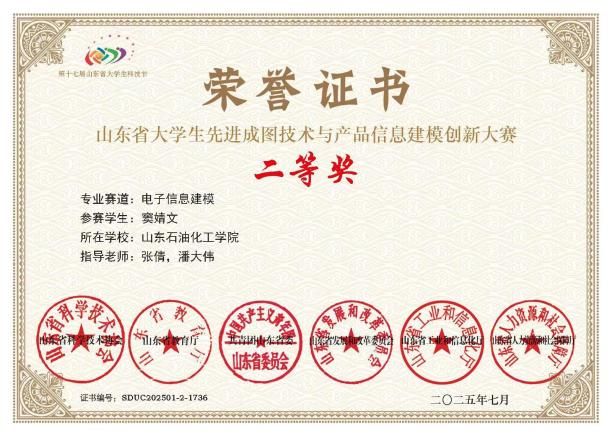 在夯实理论基础的同时,窦婧文同学深刻理解“以赛促学”的重要性,积极在学科竞赛中寻求突破。她将课堂所学与前沿科技、工程实践紧密结合,在多项国家级和省级高水平竞赛中屡创佳绩。在全球校园人工智能算法精英大赛中,她凭借对智能算法的深入理解与优化能力斩获一等奖;在全国企业竞争模拟大赛中,她运用电气工程专业知识构建决策模型,展现了卓越的分析能力与团队协作精神,荣获一等奖。她还获得过中国机器人及人工智能大赛二等奖、全国大学生信息安全与对抗技术竞赛二等奖、中国高校计算机大赛三等奖、山东省大学生先进成图技术与产品信息建模创新大赛二等奖、全国三维数字化创新设计大赛山东赛区二等奖等国家级奖项7项,省级奖项近20项,校院级奖项若干。这些经历不仅锤炼了她解决复杂工程问题的能力,更培养了她“敢闯会创”的创新意识。